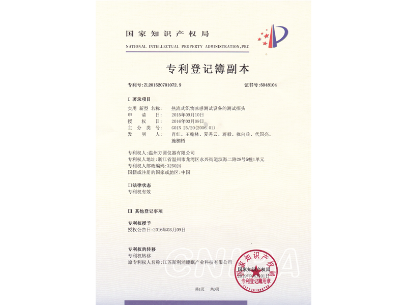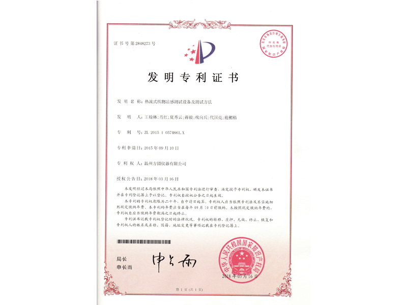 中國發明專利:熱流式織物涼感測試設備及測試方法(ZL 2015 1 0574661.X)