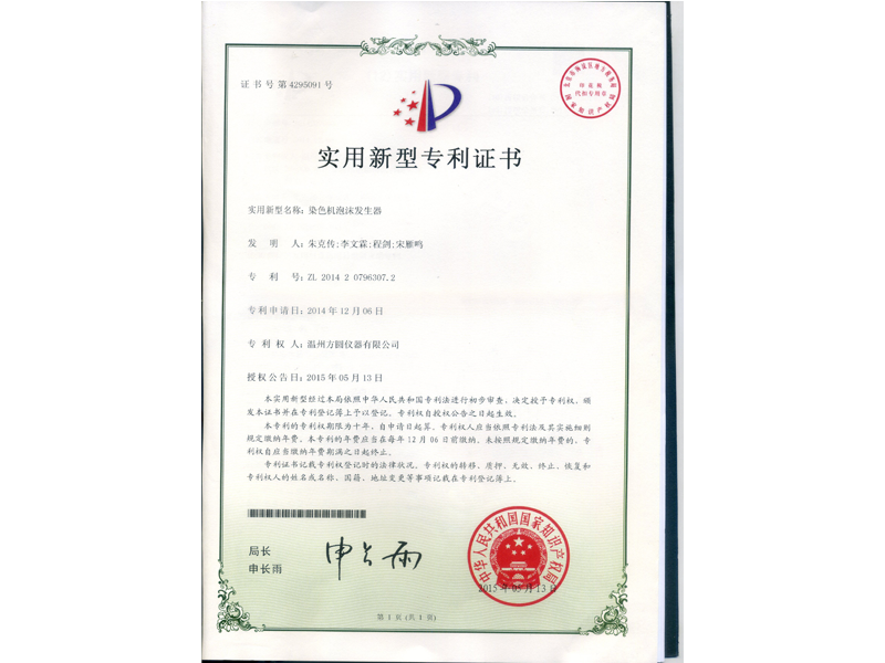 中國實用新型專利:染色機泡沫發生器(ZL 2014 2 0796307.2)