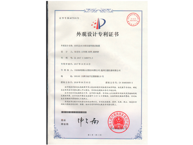 中國外觀設計專利:紡織品水分蒸發速率測試裝置(ZL 2017 3 0489773.5)