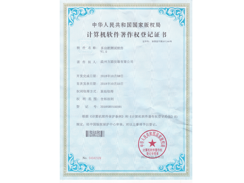 中華人民共和國國家版權局 計算機軟件著作權登記證書:多功能測試軟件V1.0(軟著登字第3071348號)