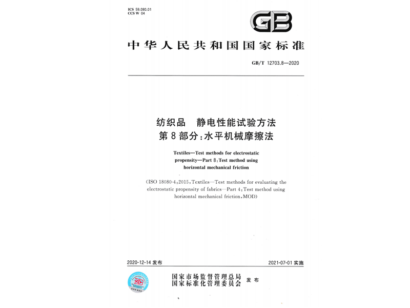參與起草《紡織品 靜電性能試驗方法第8部分:水平機械摩擦法》(GB/T 12703.8-2020),該標準由國家市場監督管理總局、國家標準化管理委員會于 2020-12-14 發布