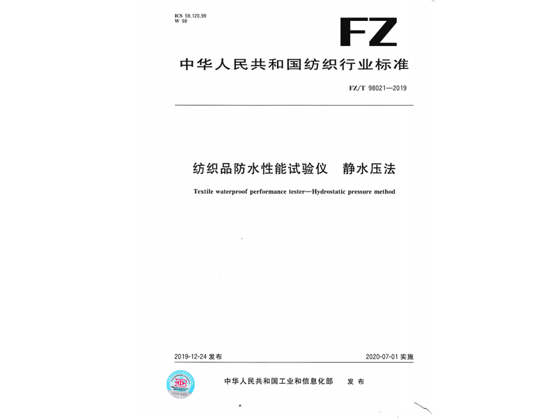 參與起草《紡織品防水性能試驗儀 靜水壓法》(FZ/T 98021-2019),該標準由中華人民共和國工業和信息化部于 2019-12-24 發布
