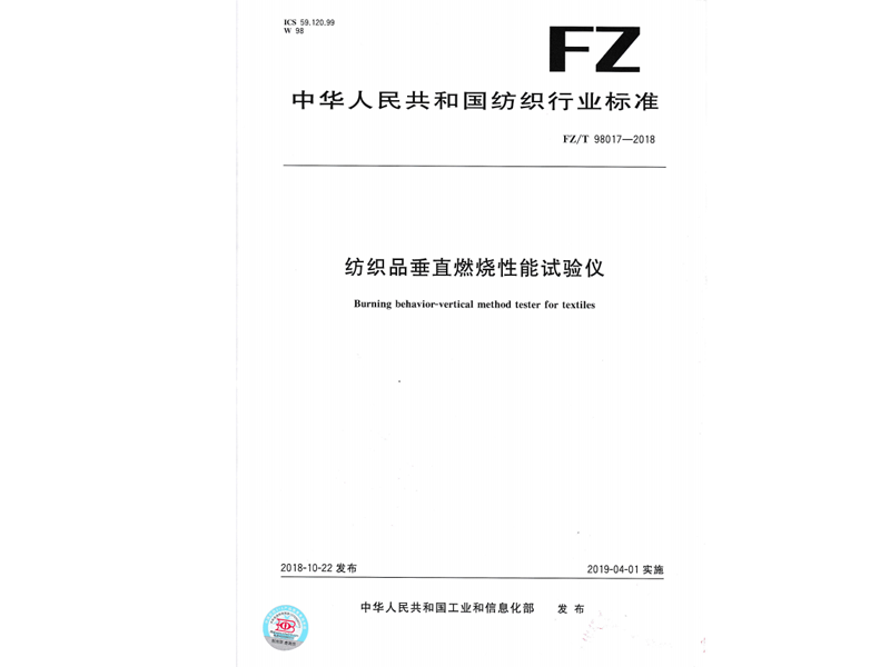 參與起草《紡織品垂直燃燒性能試驗儀》(FZ/T 98017-2018),該標準由中華人民共和國工業和信息化部于 2018-10-22 發布