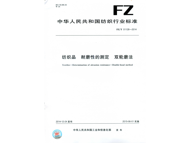 參與起草《紡織品 耐磨性的測定 雙輪磨法》(FZ/T 01128-2014),該標準由中華人民共和國工業和信息化部于 2014-12-24 發布