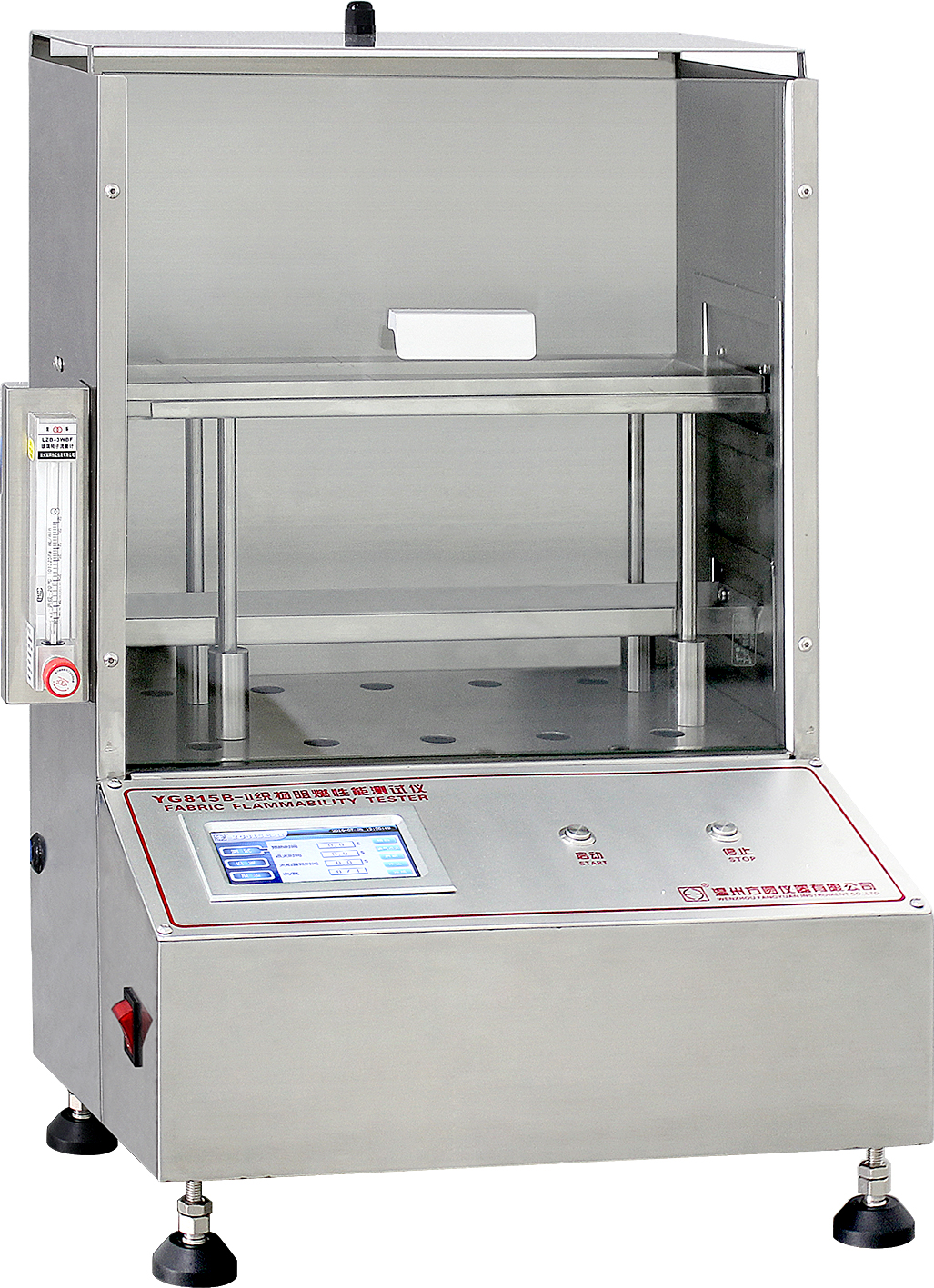 130 YG815D-II織物阻燃性能測試儀(小45度法) GB/T14644-2014、ASTM D 1230、16CFR 1610等標準。